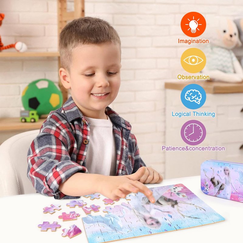 - Princess Puzzles-- Every Package Includes Puzzle 60 Pieces,A Tin Box, An Original Picture.The Elsa Princess Puzzle Is Housed In A Durable, Eco-Friendly Metal Tin, Which Is Not Only Sturdy For Long-Term Storage But Also Recyclable, Promoting Sustainability. And Help Children Gain A Sense Of Accomplishment In The Puzzle Process.
