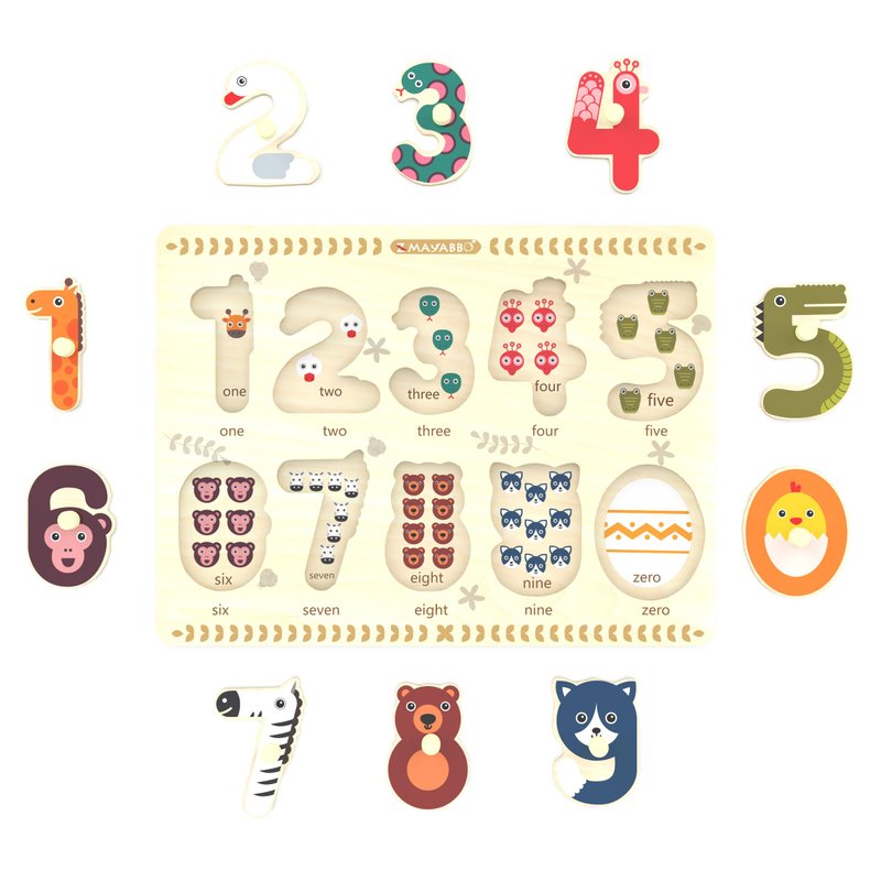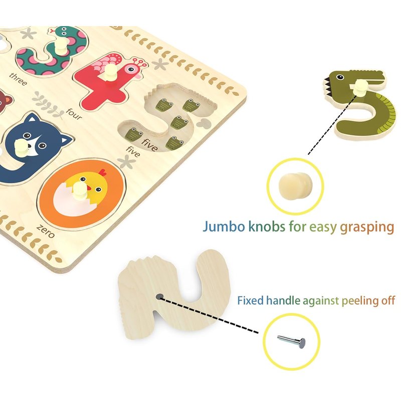 - Toddler wooden puzzles featuring 10-piece wood number peg puzzles for matching numbers with pictures on the sturdy puzzle board, coming with bright color and cute illustrations of numbers, will be a great early educational learning toys for kids.