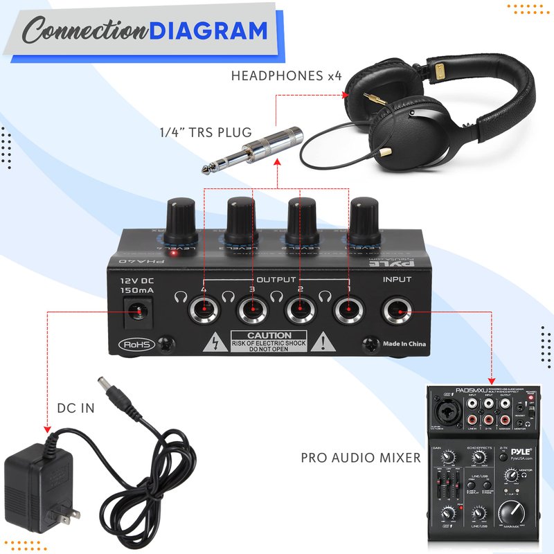 - ¼” TRS OUTPUT JACKS: This 4-channel headphones splitter is equipped w/ 4 ¼” stereo headphone TRS output connector jacks which allow you to control up to 4 headphones at once. Also equipped w/ ¼” TRS source input connector jack for your Pyle Pro mixer