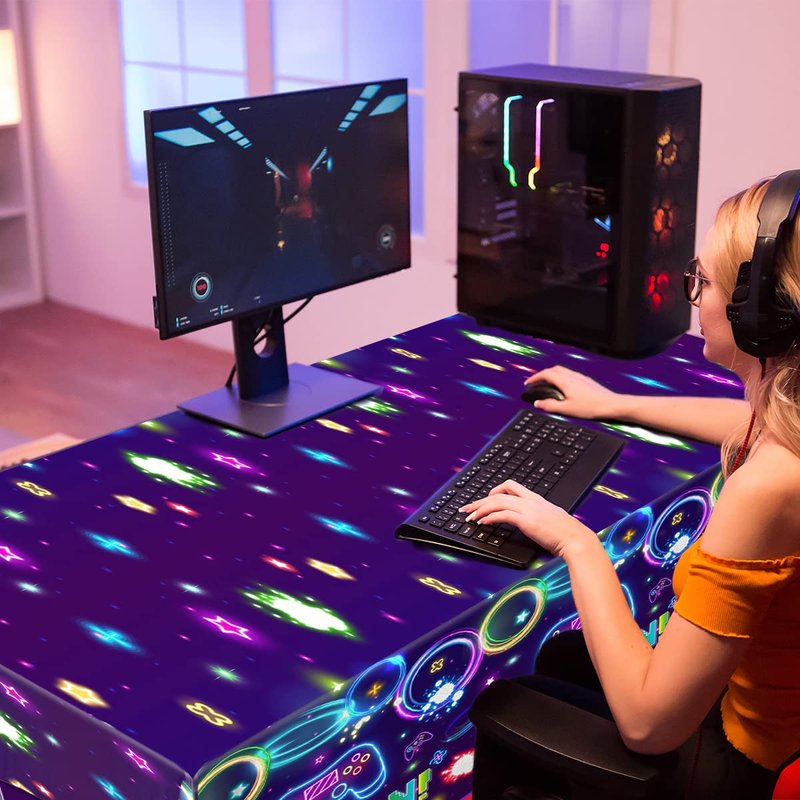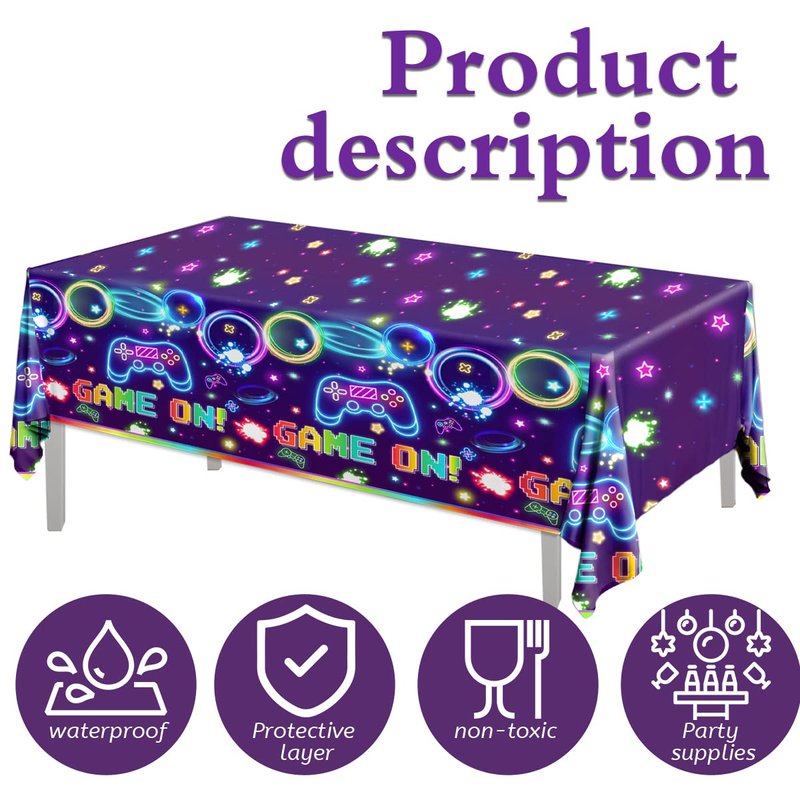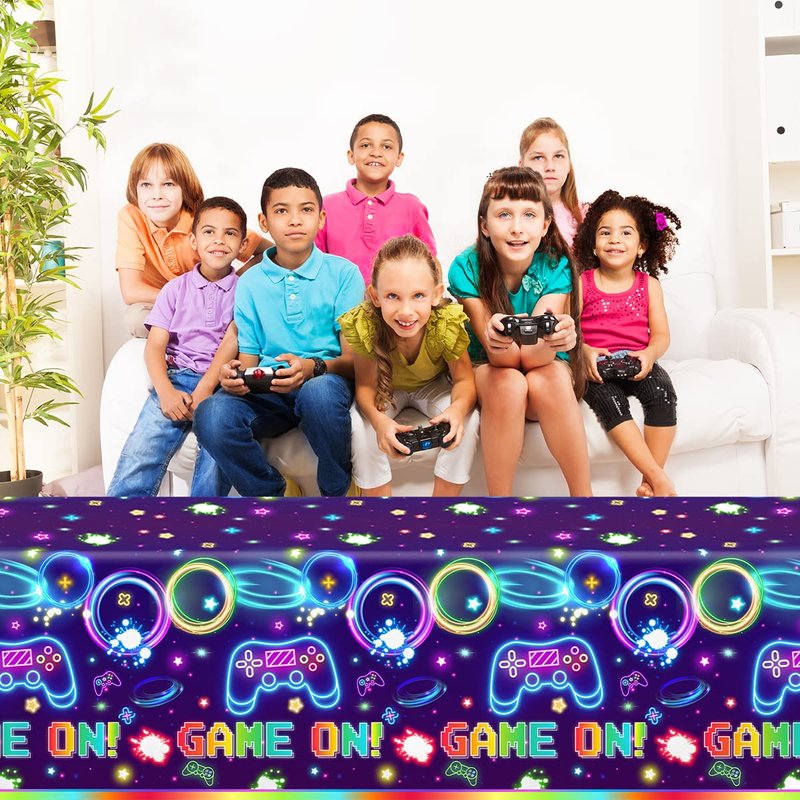 - 【Creative Design】 The gaming birthday decorations are printed with many cool patterns, which can add an exciting and happy atmosphere. The baby shower games tablecloth for boy are printed with gamepad controller shape neon sign,stars, colorful round patterns and the words 'Game On'. The neon game on tablecloths are a wise choice for girl and boy video game theme birthday parties and will leave a lasting impression on the video game theme party.