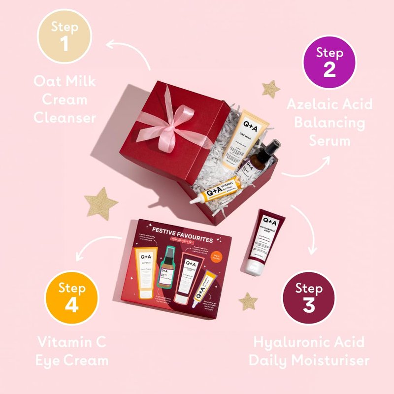 - Q+A Festive Favourites Gift Set, containing a Hyaluronic Acid Moisturiser (75ml), an Oat Milk Cream Cleanser (75ml), an Azelaic Acid Serum (30ml), and a Caffeine Eye Serum (15ml)