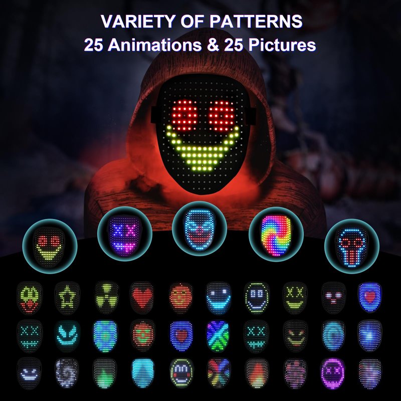- 50 Cool Face Patterns: This led mask features 234 high-brightness LED beads, offering stunning clarity and brightness that looks amazing in the dark. With 25 dynamic and 25 static patterns to choose from, you'll be the star of any Halloween event