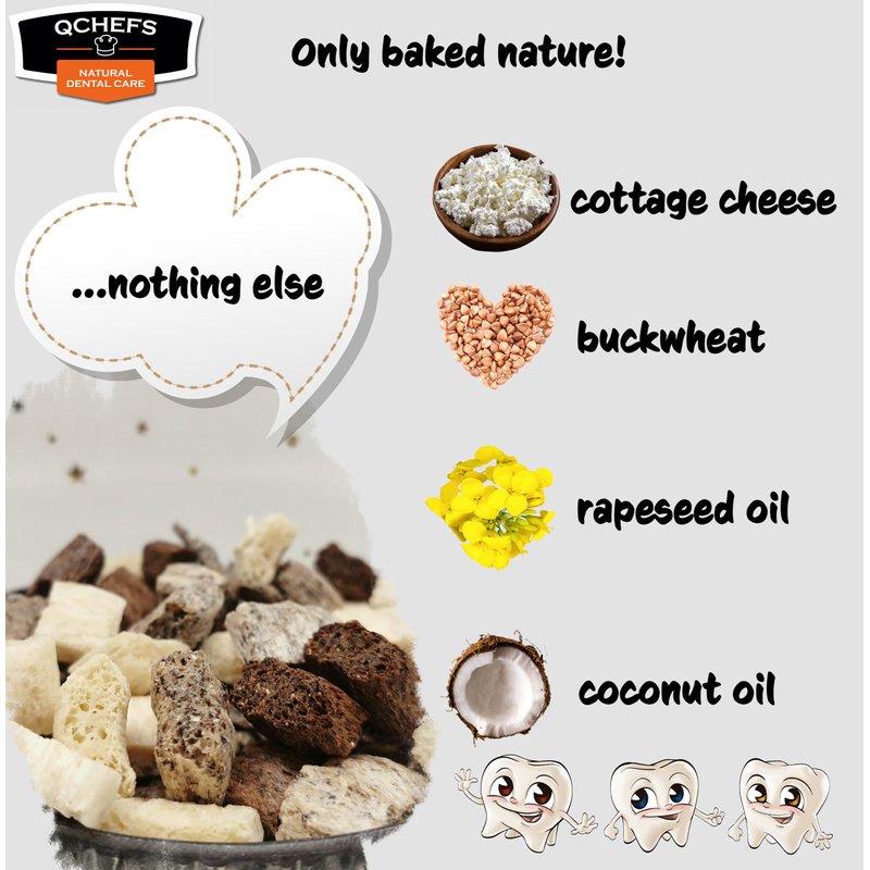 - π¦· QCHEFS Dental Flakes: QCHEFS Dental Flakes serve as a solution aimed at addressing two common canine dental issues β bad breath and tartar build up. These flakes are formulated to specifically target these problems, providing dog owners with an effective means of maintaining their furry friends' oral health. *One pack will last approximately one month depending on dog size.