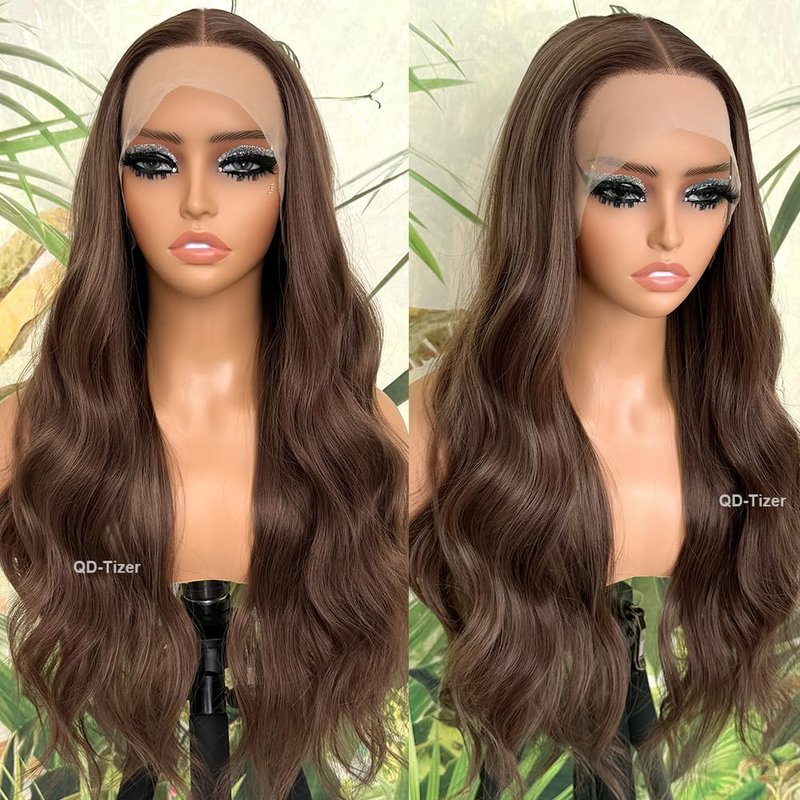 QD-Tizer Loose Curly Brown Lace Front Wig Synthetic Long Highlight Brown Wigs Pre-styled Long Body Wave Wavy Curly Hair 13×4 Lace Wigs for Women Natural Glueless Synthetic Wigs for Daily Use