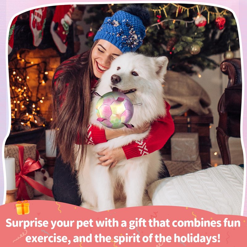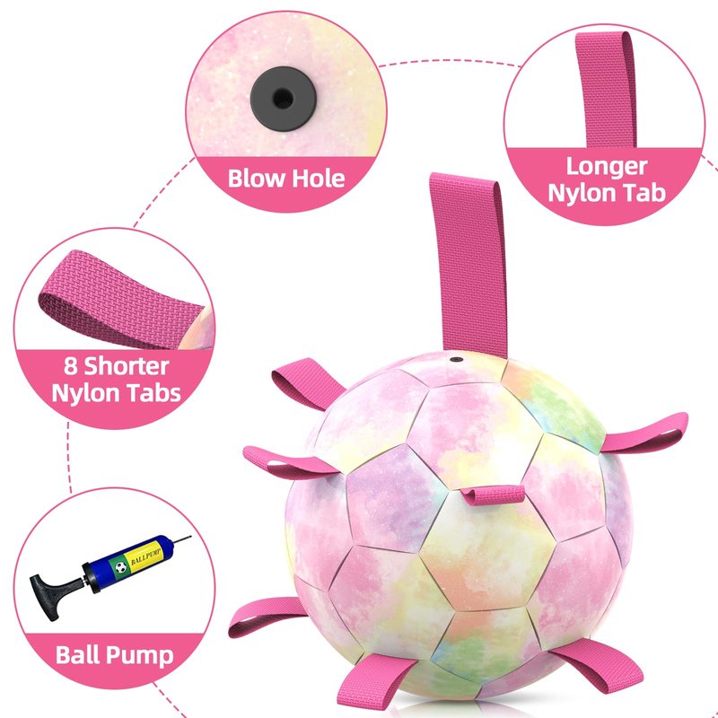 - Interactive Dog Toy: Dog soccer ball with nylon straps sewn evenly into the seams not only create an erratic bounce that dogs love to chase, but also make it easier for the dogs to fetch, toss, tug and retrieve. There's a longer strap for people to hold onto the ball, making it a great interactive dog toy to train your dogs