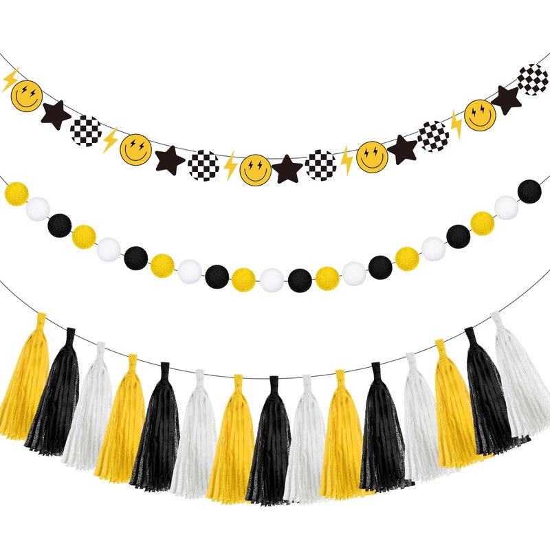 - Size Information: the diameters of the yellow, black and white discs are 0.98 inch/ 2.5 cm; The diameter of the yellow smile face and the black and white grid is about 2.2 x 2.2 inches/ 5.5 x 5.5 cm; The yellow lightning is about 0.98 x 2.2 inches/ 2.5 x 5.5 cm; The black star is about 2.2 x 2 inch/ 5.5 x 5.2cm; Each letter is also about 2.2 x 2 inch/ 5.5 x 5.2cm; The paper tassels are about 9.8 x 13.8 inch/ 25 x 35 cm, the right size to be eye catching at parties