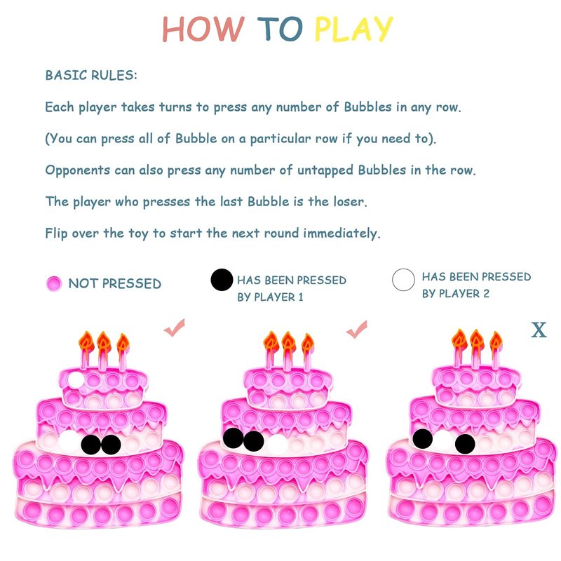 - 【fidget toys 4 pcs】5 packs: 1x gift fidget push bubble toys, 1x cake bubbles, 1x crown fidget bubble toy, 1 pizza push toy.