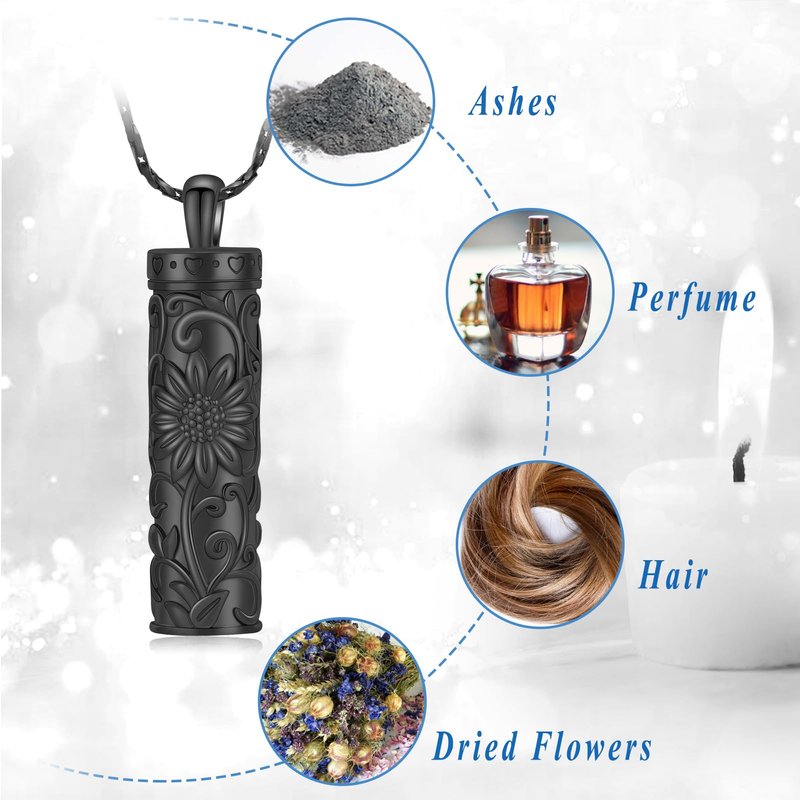 - 【Sunflower Necklace Design】The Sunflower Cylinder Bar Keepsake Necklace is designed as urn to fill with lover’s ashes or hair. The sunflower's symbolizes vitality, intelligence, and happiness.Sunflowers are well-known for being a happy flower and the perfect bloom for a summer flower delivery to brighten someone's mood! A special way to remember someone & keep her or he close to your heart at all times.