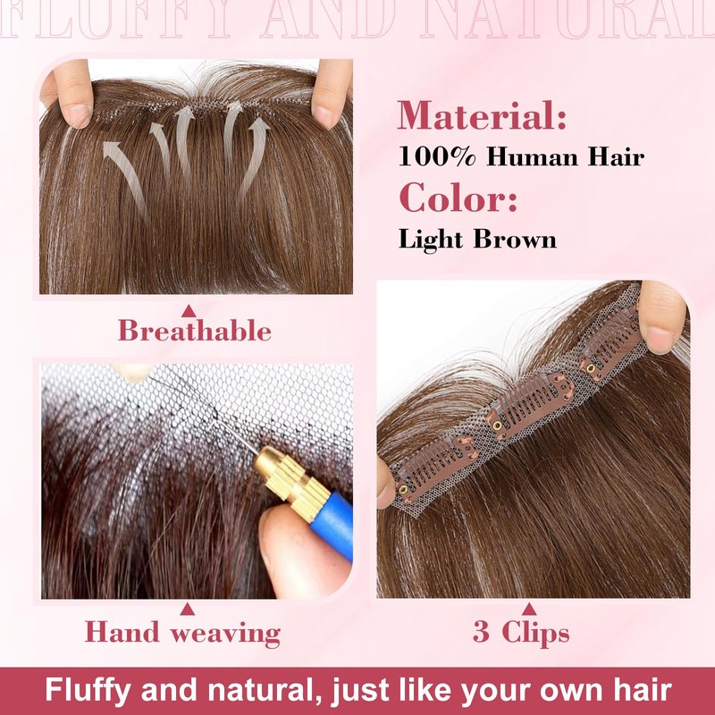 QGZ Clip in Bangs Hair Clip 100% Real Human Hair Clip on Bangs for Women 3 Secure Clip in Hair Extension Natural Full Coverage Thick French Fake Bangs (Light Brown)