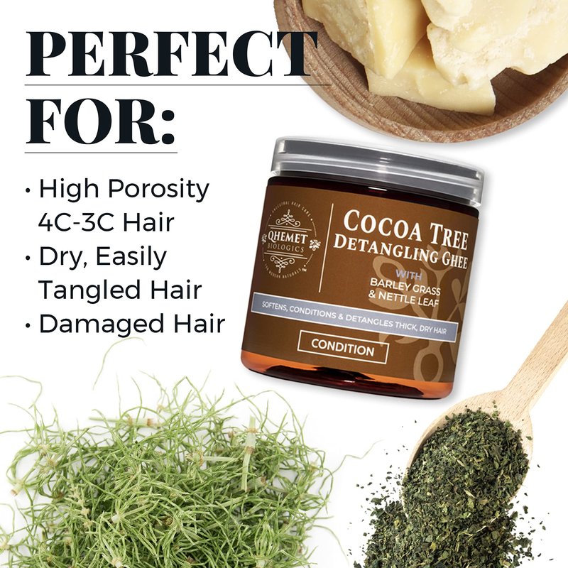 Qhemet Biologics Cocoa Tree Detangling Ghee - Softening Detangler Ideal for High Porosity 4C-3C Hair - Makes Combing Easier & Restores Pliability, Elasticity & Softness to Dry, Matted Hair (9 oz)