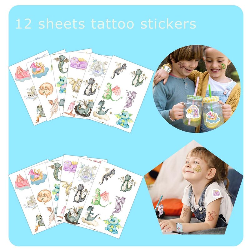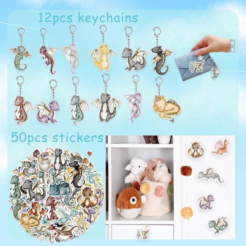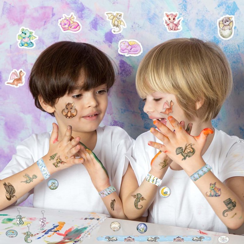 - Dragon Birthday Party Favors: Dragon birthday party favors contains 12 dragon slap bracelets,12 dragon button pins, 12 dragon key chains, 50 dragon stickers and 12 sheet dragon temporary tattoos, vivid colorful magical dragon patterns and whimsical dragon elements, pastel watercolor dragon party supplies will be the highlight of your party