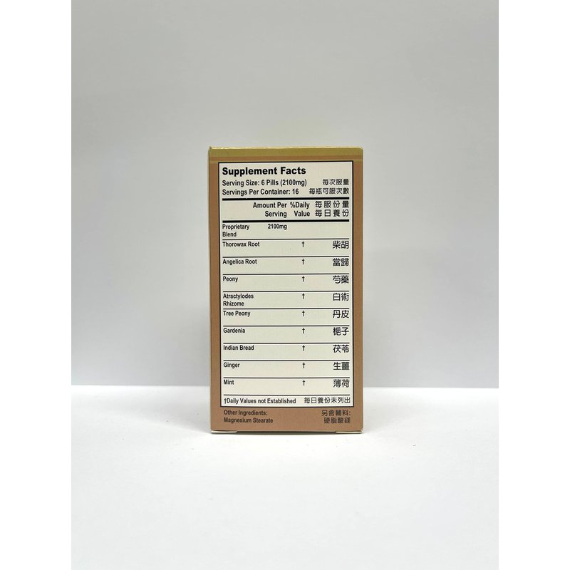 Ingredients: Thorowax Root, Angelica Root, Peony, Atractylodes Rhizome, Tree Peony, Gardenia, Indian Bread, Ginger, Mint.