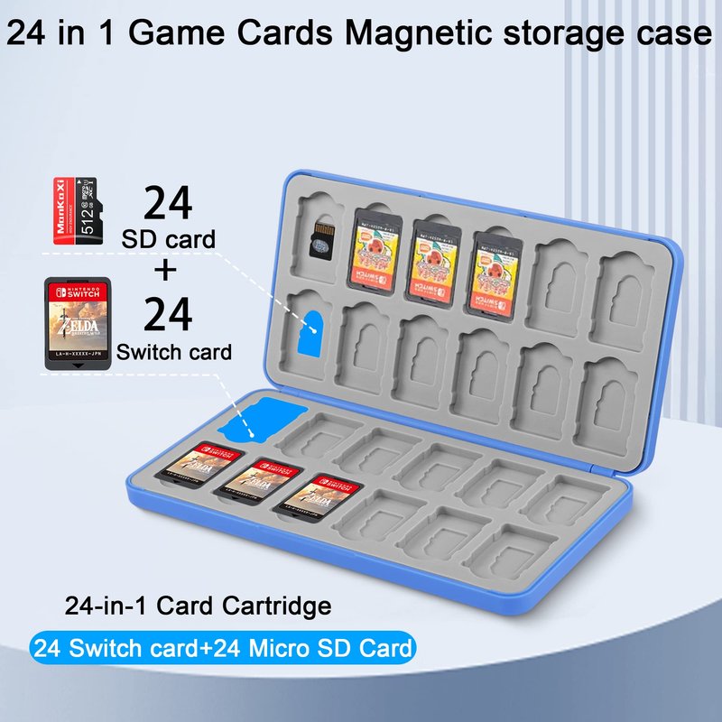 24 in 1 Game card magnetic suction Storage case organiser. Holds up to 24 Switch cards + 24 Micro SD game cards, centrally storing your Nintendo Switch cassette and Micro SD game memory cards for easy access at all times.