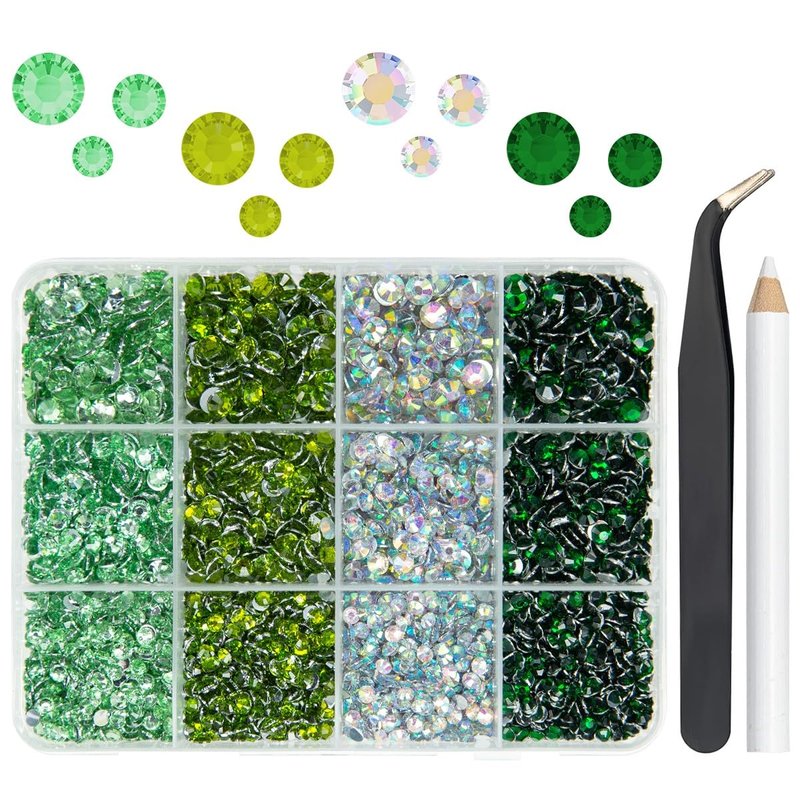 - ❤【4-Color Mega Collection】 For those who love DIY crafts, a set of resin crystal rhinestones with multiple colors is always a favorite. The qiipii Green AB Series collection allows you to have 4 color options in a low cost. Each color is carefully arranged in the box, making it visually appealing and pleasing to the eye. Opening the lid is like opening a box of light green/olive green candy, helping you effortlessly unleash your creative imagination in your craftwork.