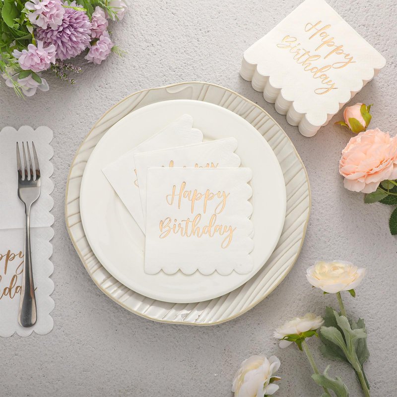 - White and Gold Napkins: the happy birthday napkins are designed with scalloped edges, and printed with the words" Happy Birthday" in gold foil, enhancing the aesthetic appeal of the birthday party setting, the gold foil provides an added luxurious effect, and express the happiness and warmth of the moment, adding to the celebratory atmosphere