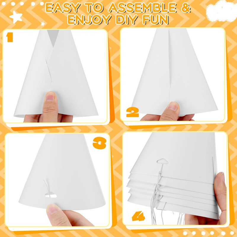 - Simple and Practical: you only need to spend a few minutes to assemble the DIY white party hat; First, bend the white cardboard into a cone shape, fasten it according to the position of the card slot on the back of the cardboard; Then pass the elastic cord through the holes at both ends of the hat, adjust to the appropriate degree of tightness, and then put on the hat easily; It is convenient for you to have a birthday hat