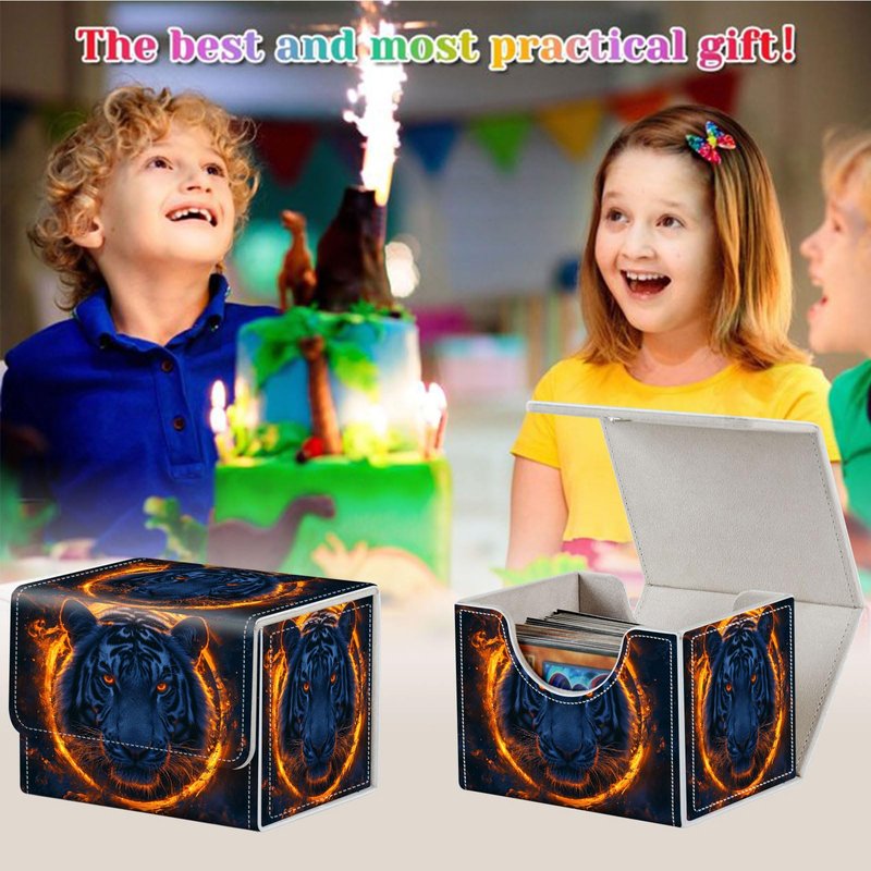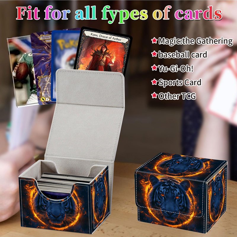 Qindaiwen Card Deck Box for MTG, Fits 100+ Single Sleeved Cards, PU Leather Trading Card Storage Box for TCG, CCG, MTG Cards, Strong Magnet Magic Gathering Deck Box, Flame Tiger