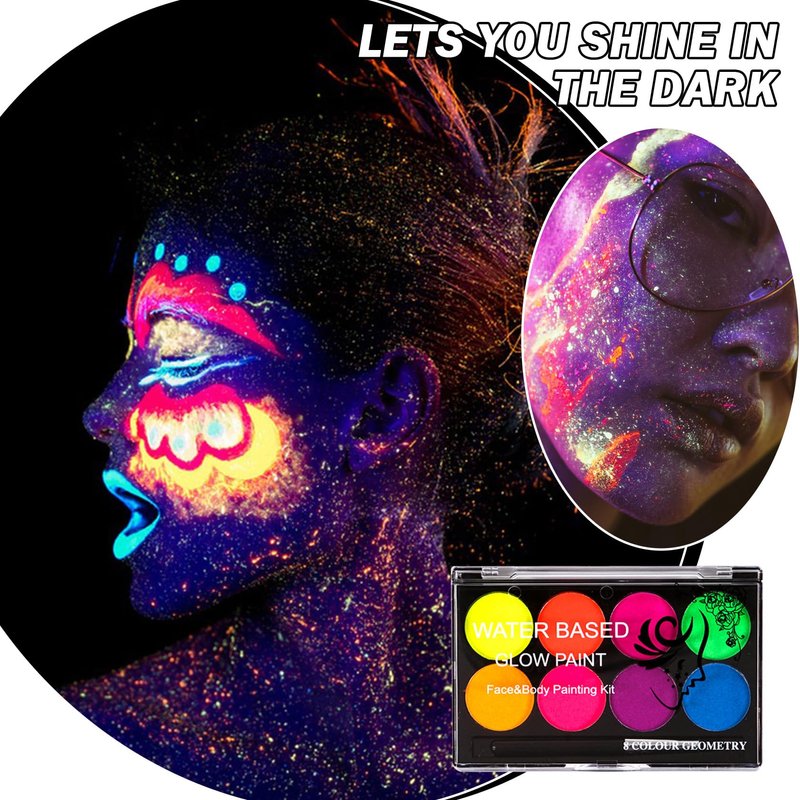 Neon face paint is available in 8 neon shades,allowing you to choose different colors for different moods or occasions.During the day,the face is a bright neon light,in the dark,the face paint does not glow unless under a UV black light.