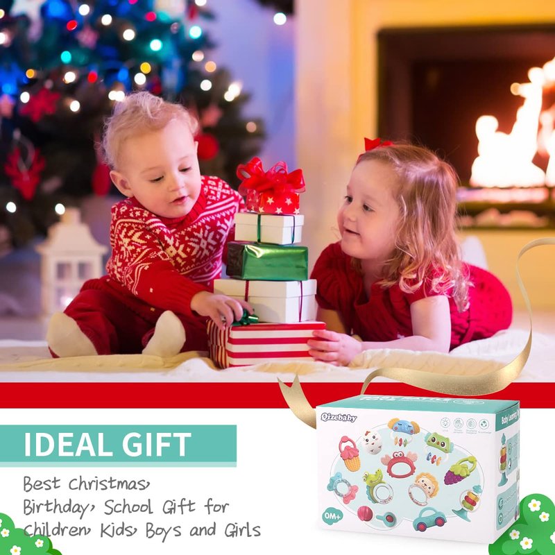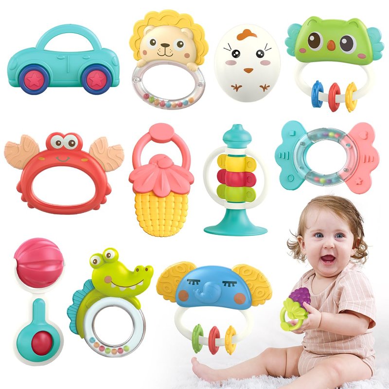 - [12PCS Baby Rattle Teething Toys] The baby toys with 12 PCS rattle teethers has numerous sounds and bright colors, various shapes and sizes. Shaker, grab and spin, teething toys for different stage of baby’s development.