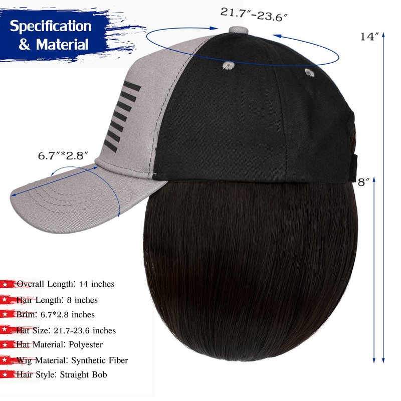 - High-quality Material~ USA flag hat wig gives you the style of a typical baseball cap combined with straight Bob, never goes out of hairstyle. The total length of the hat wig is 14'', the hairpiece is 8'' and weighs about 4.4oz. Hair extensions made from synthetic fibers are smooth and soft to the touch. The hat is made from polyester, constructed to last.