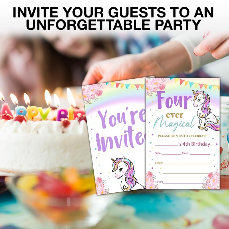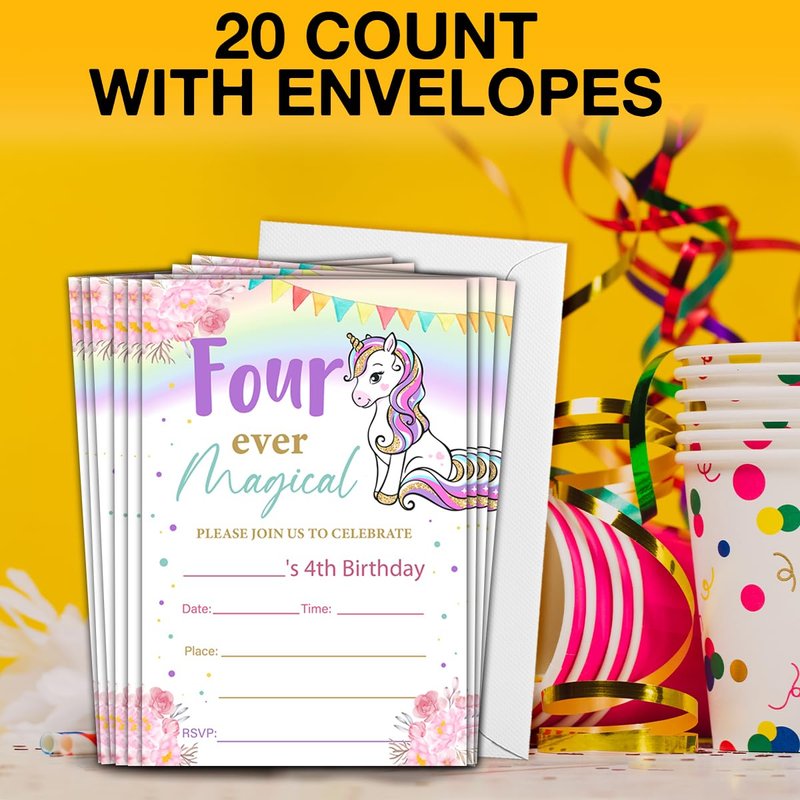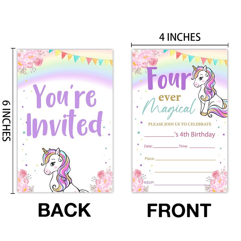 Qlnuk Unicorn 4th Birthday Invitations Four Ever Magical Unicorn Girl Forth Birthday Invites With Envelopes Set of 20