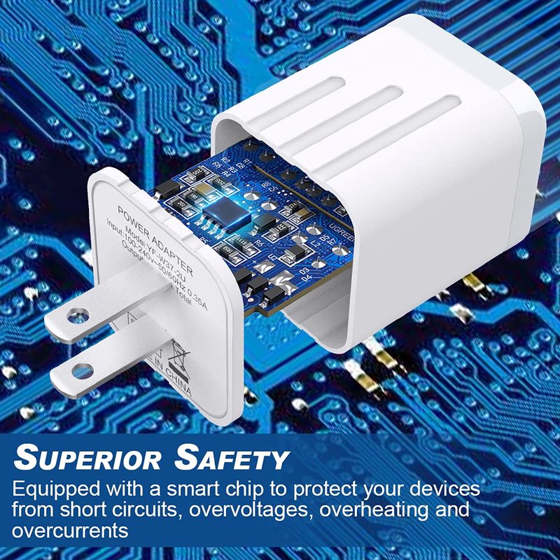 - Charger with chip inside is designed to identify fully charging with safety usage,Protection against over charging,over currents, and over heating, It uses anti-fire material to ensure 100% safe for family members.