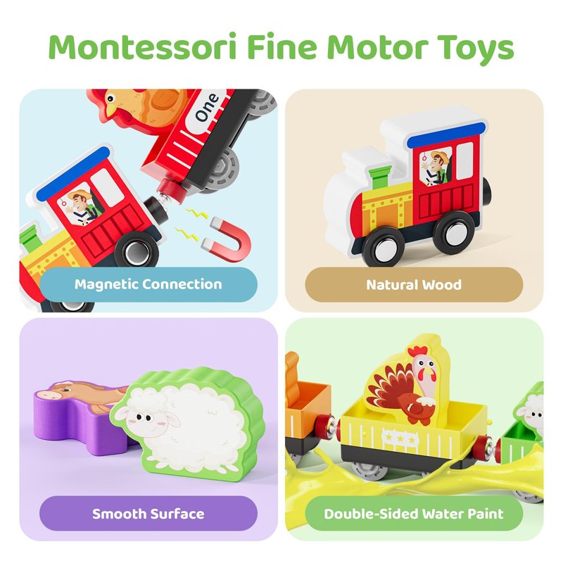 - Montessori Preschool Learning Activities: Our wooden train includes 10 magnetic train set.Kids can know and learn about 10 different farm animals and identify their characteristics from our toys.The train carriages are printed with numbers from 1 to 10,and the trains has dots corresponding to the numbers. Babies can have fun number learning and color matching sorting games based on these,exercise their counting,color recognition,classification and matching skills. Best toddler educational learning toys, let our cute animals accompany your kids through childhood