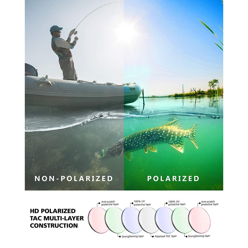 - 【HD Polarized TAC Brown Lens with Full Gold Multilayer Coating 】The TAC polarized lenses can eliminate scattered lights and reflections from the water surface. Brown lens blocks more blue light (around 30%) with a warm balance, enhance contrast and color perception of red, yellow and brown. The Full Gold Multilayer Coating creates a luxury look, reflects a certain percentage of glare & infrared and uniforms the luminance transmittance with minimum visual difference when looking at sideways.