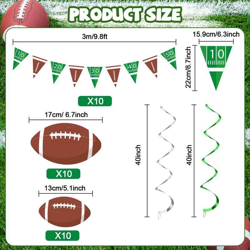 - Football party decoration set: This pack comes with 4pcs football theme party banners, 20pcs football hanging swirl decorations cards in 2 sizes(6.7inch and 5.1inch ) and 28pcs hanging swirls in silver and green. The sufficient quantity and vivid design will meet your sports party decorations needs and make your party look vibrant.