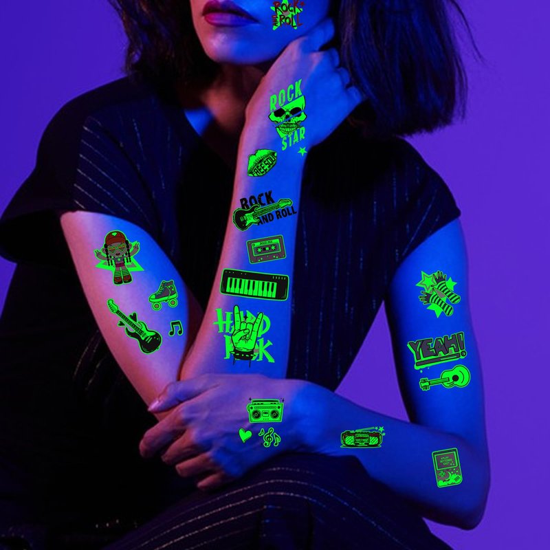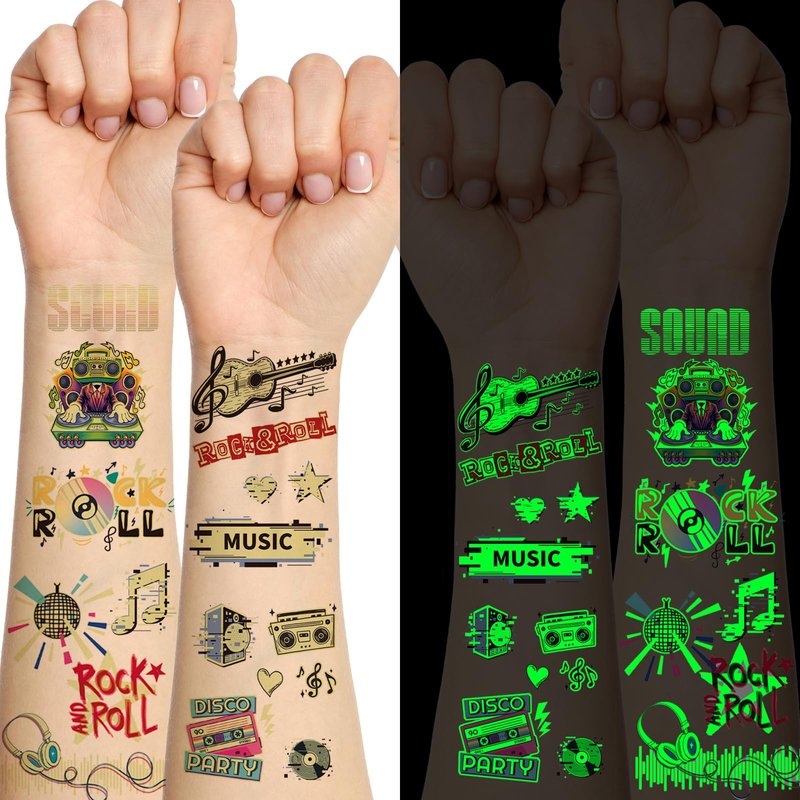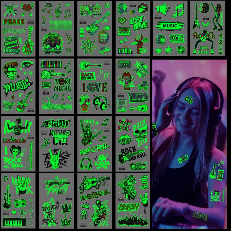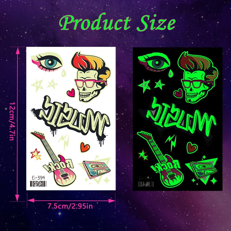 - šµćLuminous Temporary TattooćPackage contains 18 sheets of more than 110 styles, various shapes and sizes of electric guitars, musical notes, skulls and other patterns for you to choose from, a wealth of styles enough to meet the needs of your use and sharing needs, so that you can become the focus of a variety of activities!