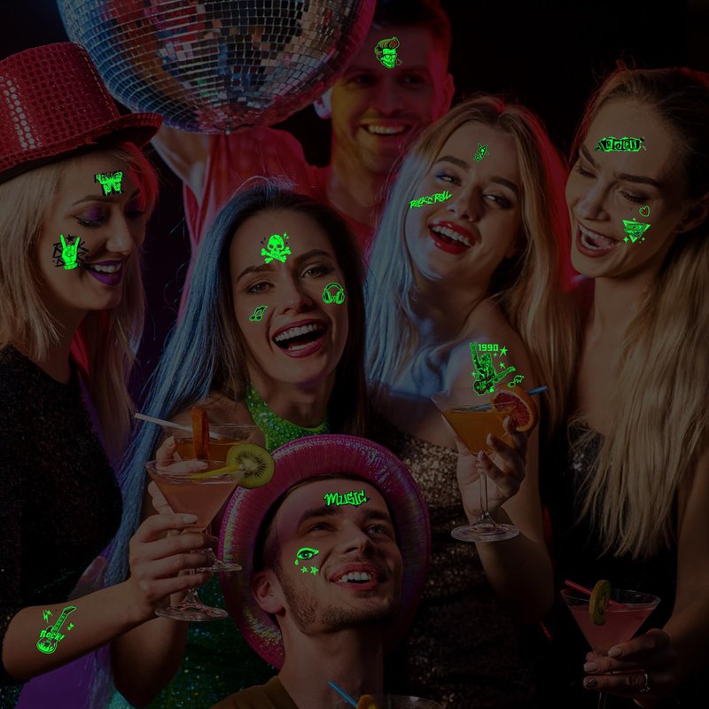 Qpout 18 Sheets Glow In The Dark Music Rock Band Star Temporary Tattoos,Luminous Guitar Rock and Roll Fake Tattoos Stickers for 90s Themed Birthday Party Decorations Favors Supplies Carnival