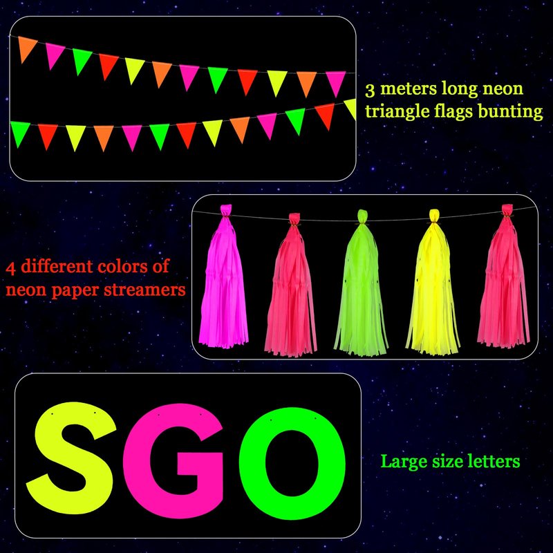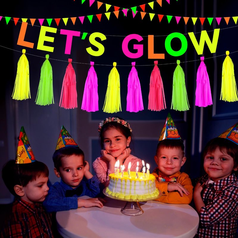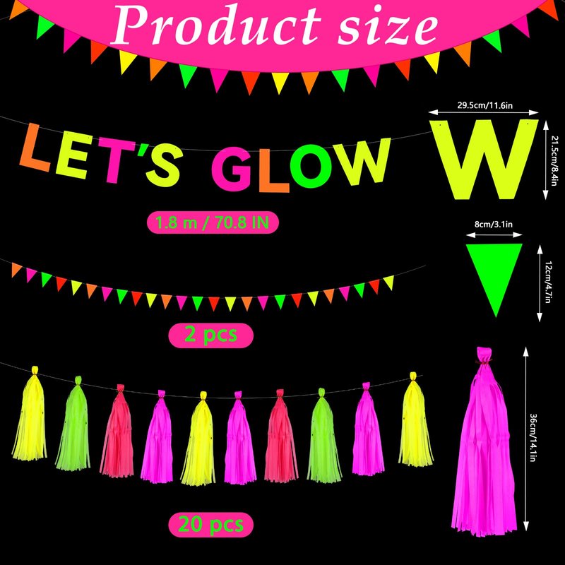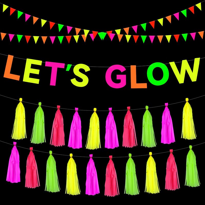 - Package Contents:In your package, you will receive 1 pcs colorful Let's Glow hanging banner, and 2pcs neon triangle banner flags, and 20 pcs of neon Paper Tassels in 4 different colors. This set comes in neon colors that will undoubtedly catch everyone's eye and add a splash of vibrancy and color to your scene!