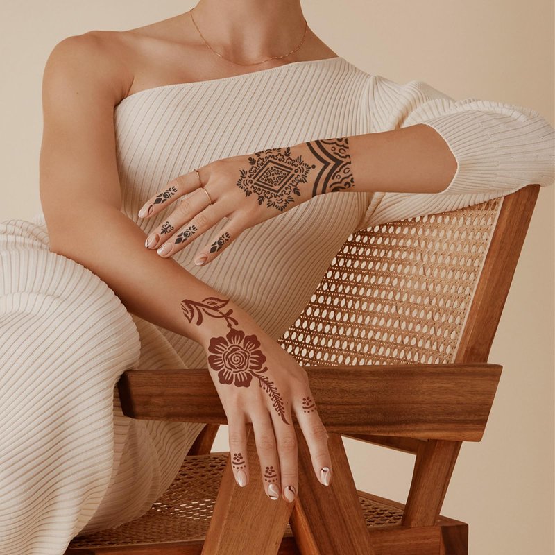 - ▶ 【Henna Stencils for Hands】Mehndi Stencils for Hands. Put the henna tattoo template on your hand, and then choose your favorite color of henna paste, such as black, brown red, silver, etc. Once it dries, and then you can see the effect of the tattoo. Tattoo stencils for real tattoos.