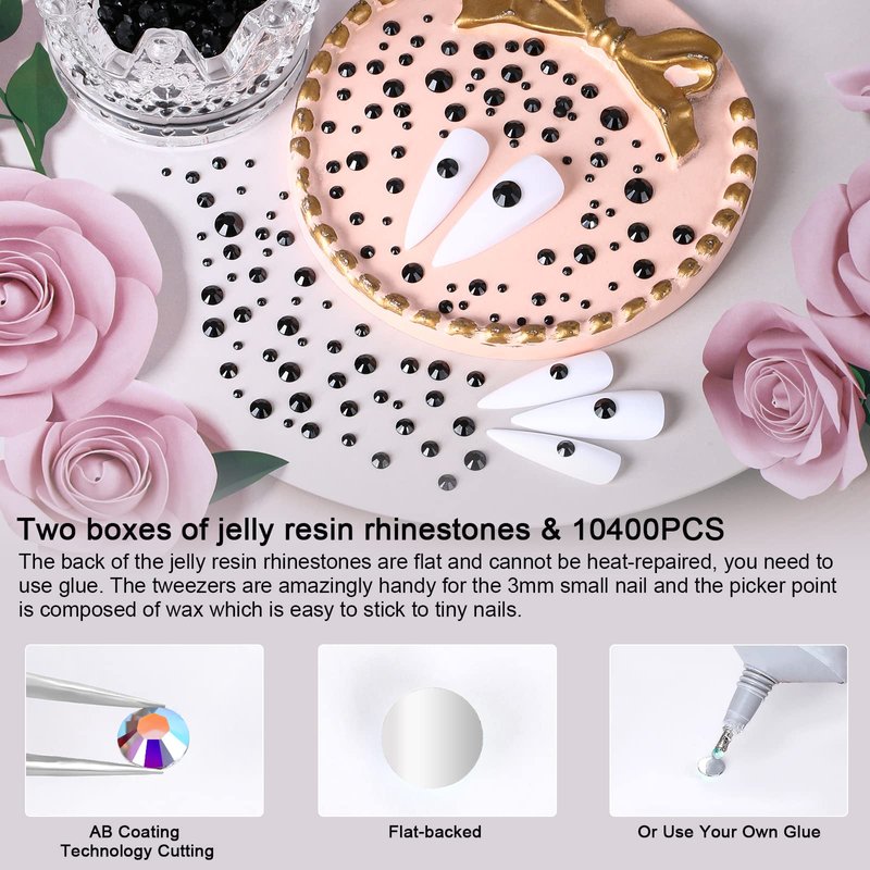 QPRETTY DU 10400PCS Black Rhinestones, Jelly Resin Rhinestones for Nails, Flatback Non Hotfix Crystals DIY Rhinestones for Crafts with 15 cm Pencil Sharpener and Tweezer & Picker Pen (Black)