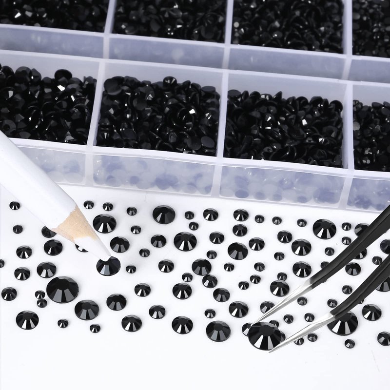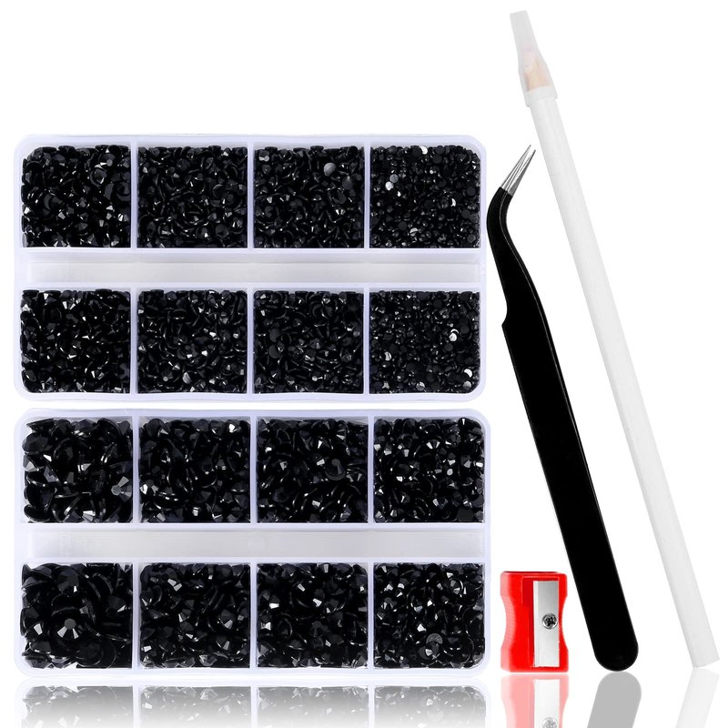 - TWO BOXES RHINESTONES: 10400PCS jelly black rhinestones for crafts & 15 cm pencil sharpener and tweezer & picker pen, you get the box rhinestones and can easy to make the crafts! Resin rhinestones use advanced diamond cutting and AB coating technology, their shine is forever / never fades. Size - 2MM: 5000PCS, 3MM: 2800PCS, 4MM: 1600PCS, 5MM: 800PCS, 6MM: 200PCS, total 10400PCS.