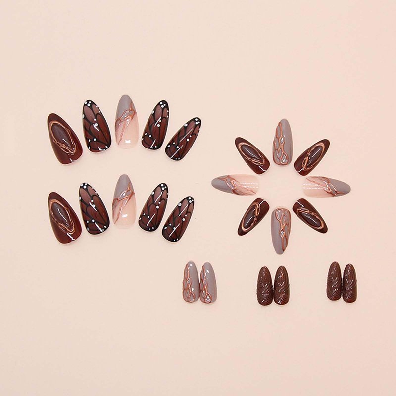 QQPPOLIU Fall Press on Nails Medium Almond Fake Nails Brown Press on False Nails with Butterfly and Striped Design Fall Nails for Women 24pcs