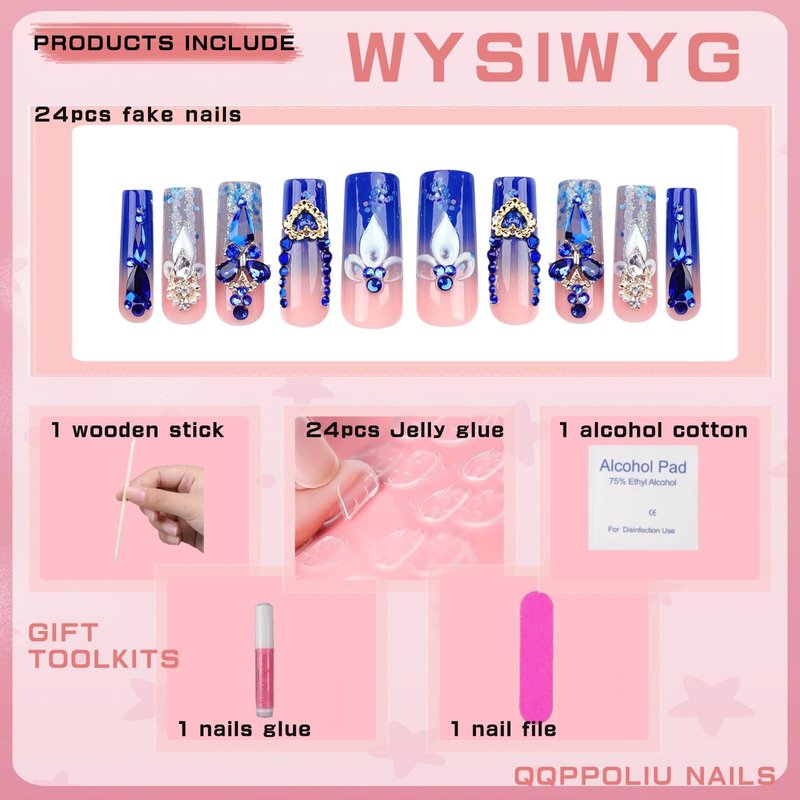 QQPPOLIU Royal Blue Press on Nails Long Length Square Shape Acrylic Fake Nails with Rhinestones Designs False Nails Mother'S Day Gift 24pcs