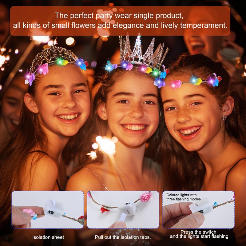 - 【Three unique lighting】:led flower crown built-in battery, no extra battery needed, just unplug the insulating piece and press the button to use, there are three light modes: fast flash, slow flash and constant light for your free choice.