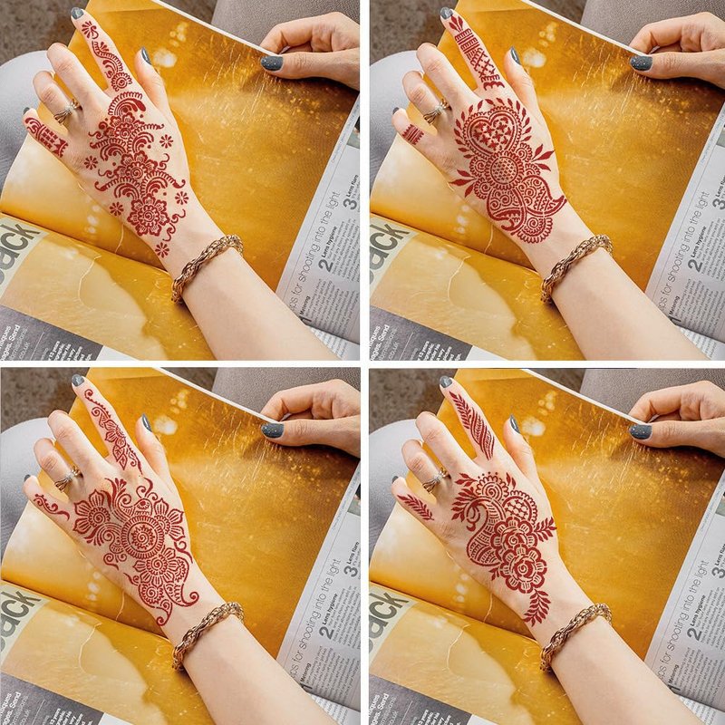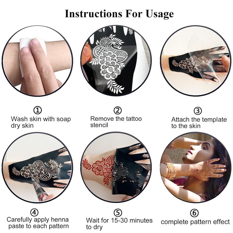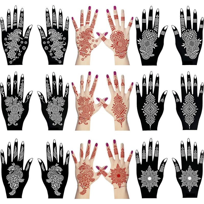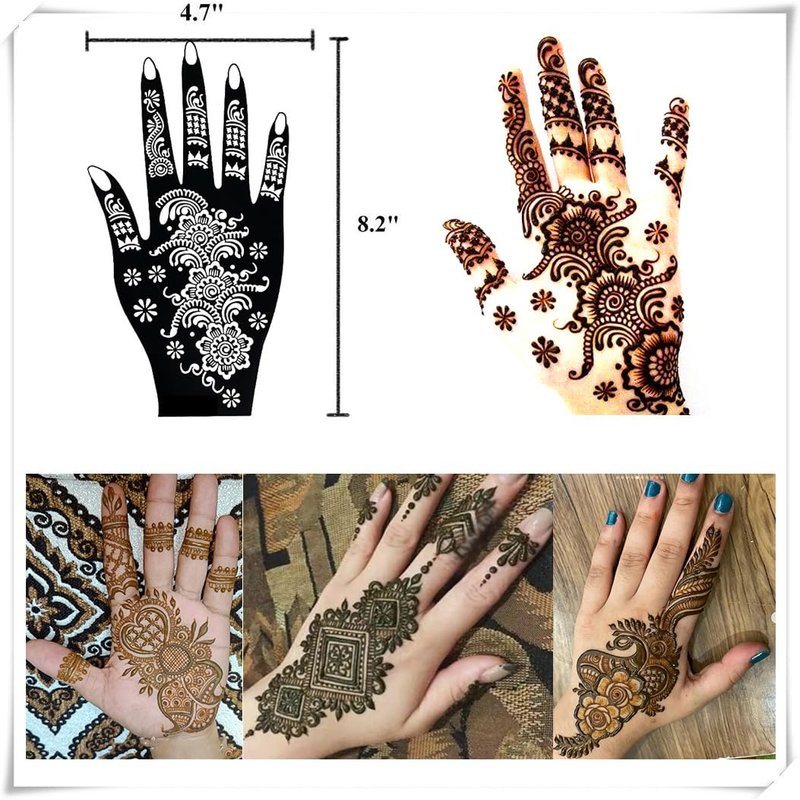 - What's included: 12 sheets (6 Pairs) henna tattoo stencils, tattoo template size: 21 cm x 12 cm/8.2" x 4.7" (Only Templates,No Tattoo Ink); Paste location: hand, finger, forearm, legs and other parts of the body