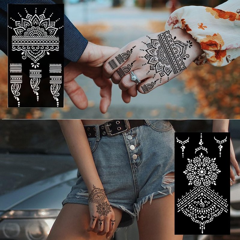 - Henna Tattoo Stencils Kit: Included 12 Sheets Self-adhesive Hand Stencils;145Pcs Glitter Airbrush Tattoo Stencils; each measurement approximately 7.6 x 4.1 inches(Only Templates,No Tattoo Ink)