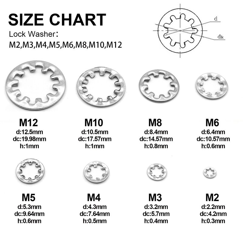 - Internal Tooth Star Lock Washers: High Quality Stainless Steel External Tooth Star Lock Washers Set of 320 pcs, includes the most commonly used 8 sizes: M2.5: 50 pcs / M3: 50 pcs / M4: 50 pcs / M5: 50 pcs / M6: 50 pcs / M8: 30 pcs / M10: 20 pcs / M12: 20 pcs.