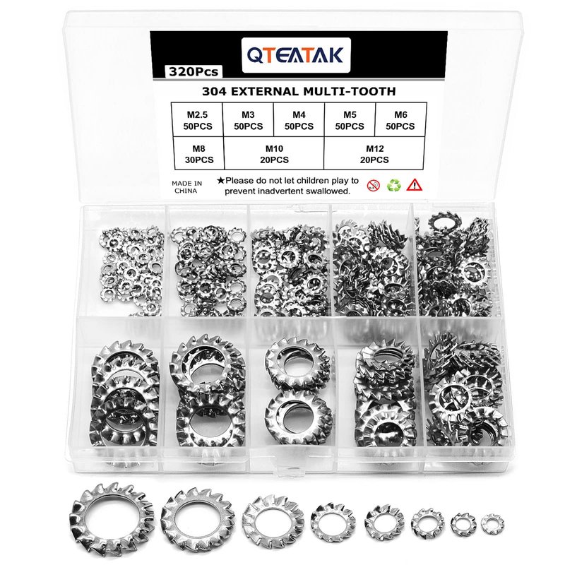 - External Tooth Star Lock Washers: High Quality Stainless Steel External Tooth Star Lock Washers Set of 320 pcs, includes the most commonly used 8 sizes: M2.5: 50 pcs / M3: 50 pcs / M4: 50 pcs / M5: 50 pcs / M6: 50 pcs / M8: 30 pcs / M10: 20 pcs / M12: 20 pcs.