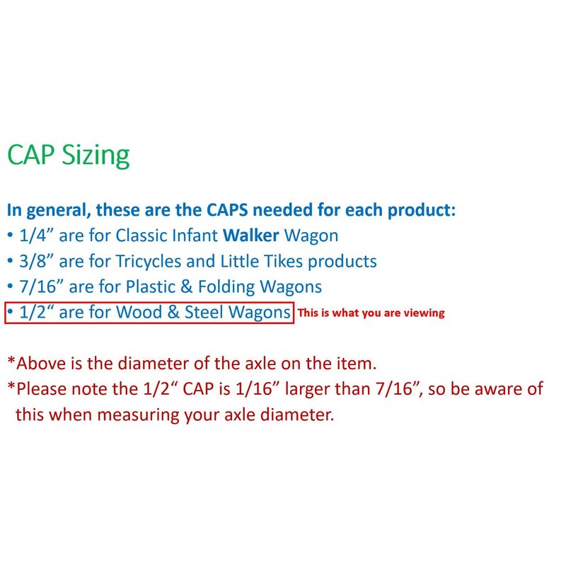 • Compatible with 1/2 inch diameter metal axles NOT 7/16" axles. DOUBLE CHECK your axle size **other sizes available like 7/16" which is slightly smaller**. Each cap measures 1.5" and the hole is 1/2 inch