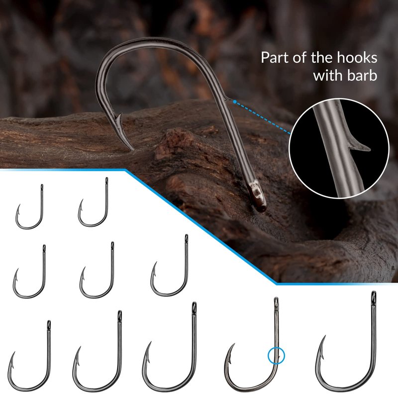 - PACKAGE INCLUDED: Dear customer, you will get 500pcs #6~#15 hooks in one box. Size X Quatity: #6 X 80PCS, #7 X 80PCS, #8X60PCS, #9X60PCS, #10X60PCS, #11X40PCS, #12X40PCS, #13X35PCS, #14X25PCS, #15X20PCS. ATTENTION: They are small fishing hooks for freshwater use. Please Make Sure that the Sizes Before Ordering.