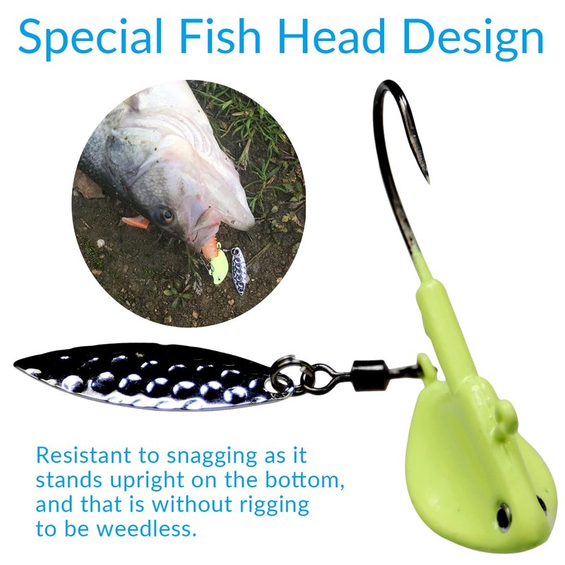 - 1.UNIQUE DESIGN: Unique lead-Fish-head design, the focus is oblique, with willow shape spinner spoon.Fish-shaped head and big 3-D eyes mimic a baitfish.