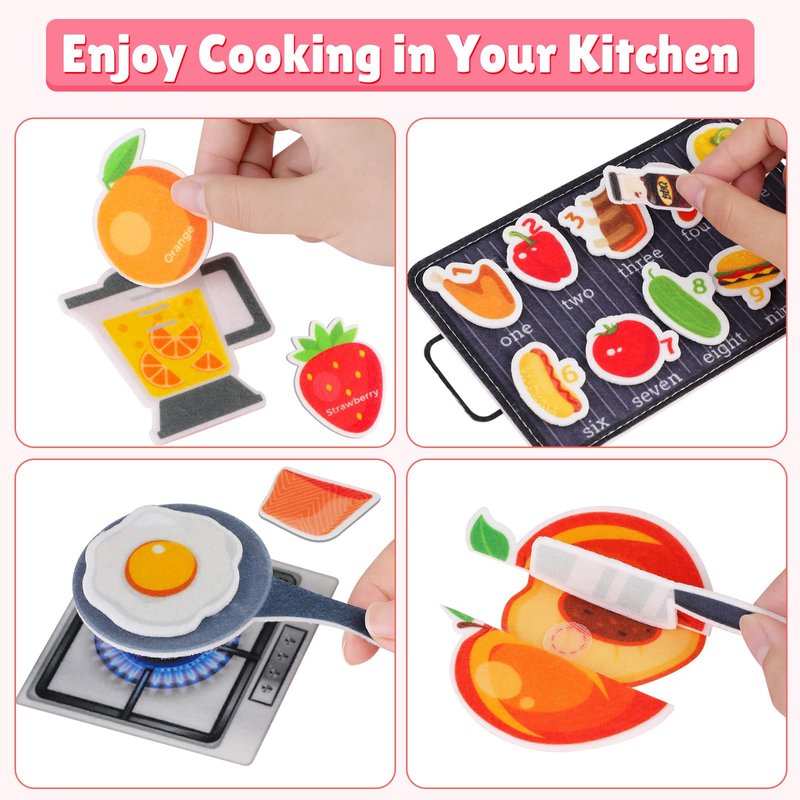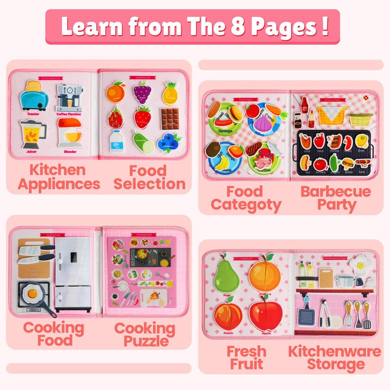- 18-IN-1 COOKING BUSY BOOK - Give your kids the happy cooking experience with Quanquer Kitchen-themed Busy Board! From various kitchenware and food to BBQ activities, each activity is designed to develop basic skills in a fun, hands-on way. This pink kitchen busy book features 8 pages of engaging content and 18 activities that spark creativity while enhancing hand-eye coordination, logical thinking, and independent learning skills for toddlers aged 18 months and up