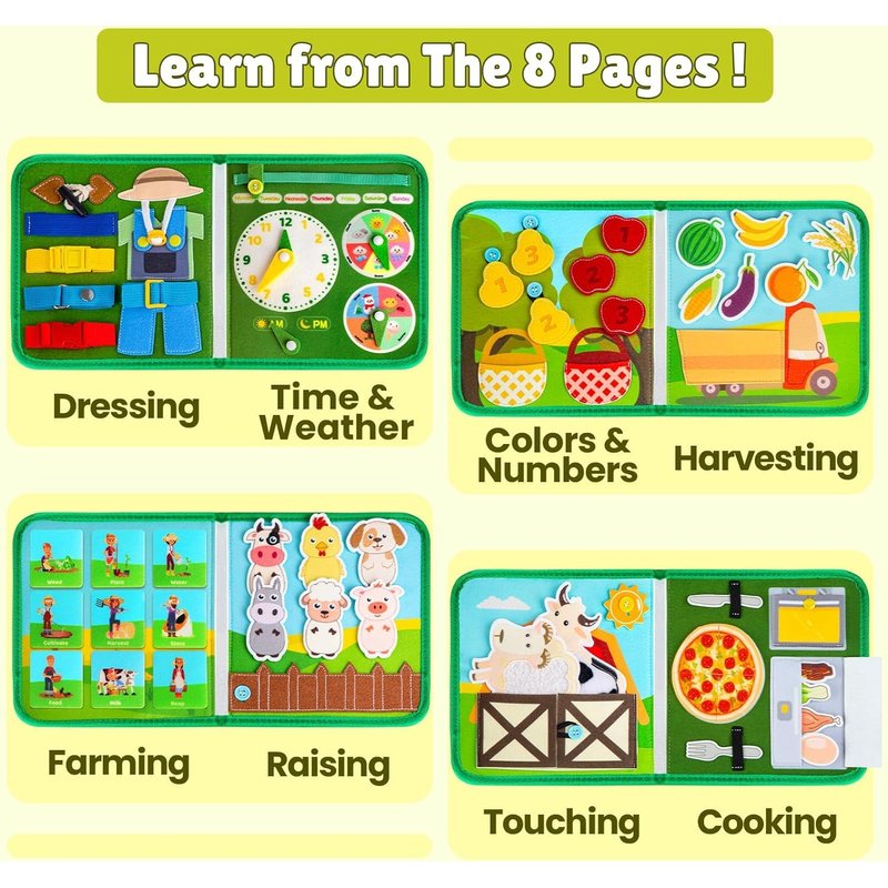 - 18 IN 1 FARM THEME BUSY BOOK - Experience the busy farm life with the montessori toys busy book! With 8 interactive pages and all 18 activities, this farm-themed busy book stimulates creativity while boosting hand-eye coordination, logical thinking, and self-directed learning for toddlers aged 1 2 3 4 year