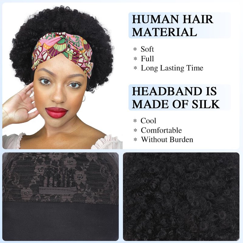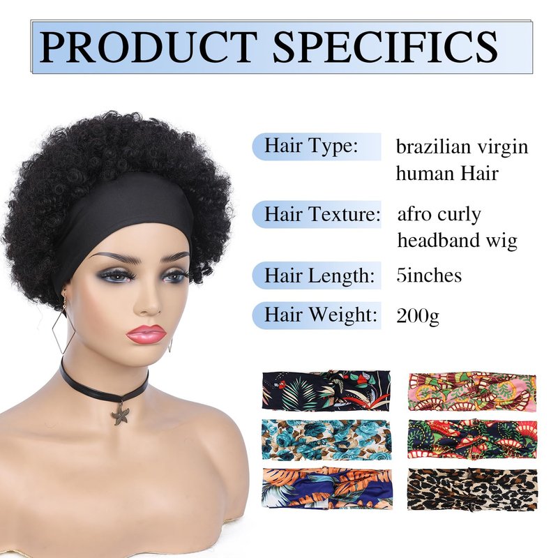 Quantum Love Headband Wig Afro Curly Human Hair Wigs Short Afro Wig Kinky Curly Brizilian Virgin Hair Wig Machine Made Headband Wigs for Women Natural Color
