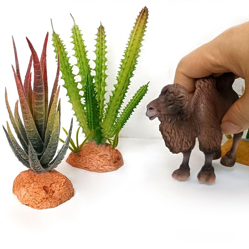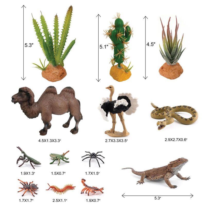 - Desert Learning - This set of toys includes 1 ostrich, 1 camel, 1 lizard, 1 rattlesnake, 3 different types of cactus plant models, and 6 fake insects. It provides your child with a rich range of miniature models for imaginative games, promotes cognitive development, and increases familiarity with different species.