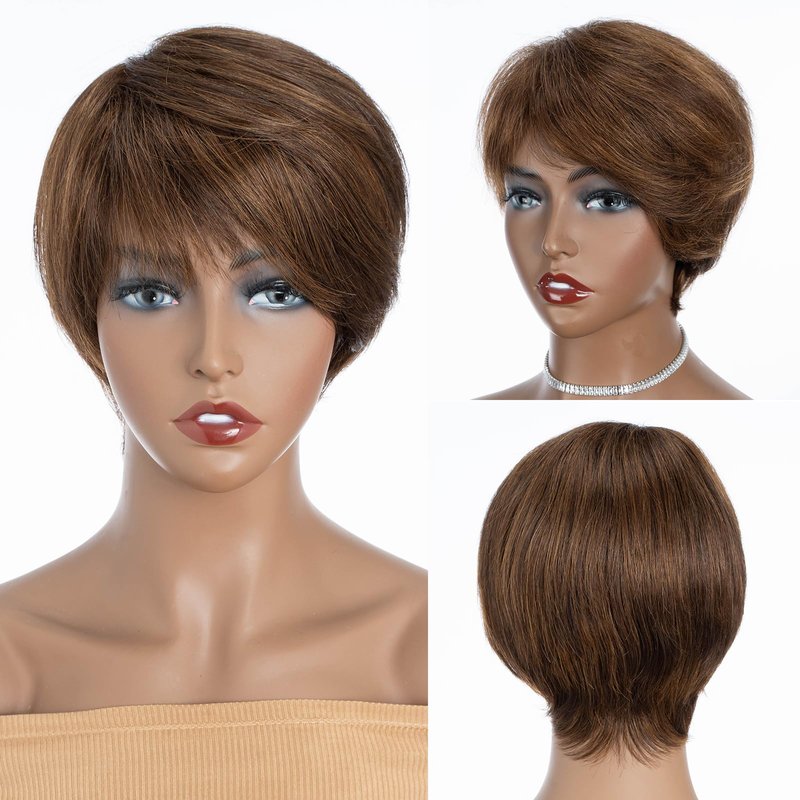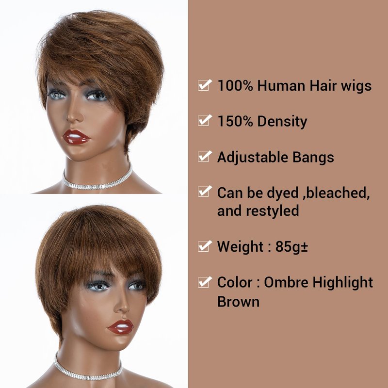 QUEEN VIRGIN REMY QVR Pixie Cut Wig Human Hair Wigs with Bangs Short Wigs for Black Women Human Hair Different Style Pixie Wig for Daily Wear Ombre Highlight Brown Color